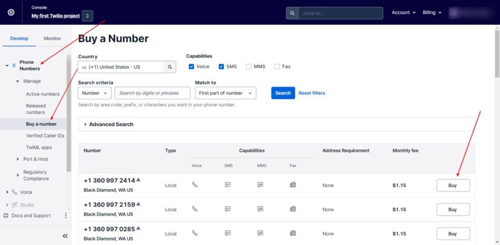 Siga la captura de pantalla a continuación para comprar un número de teléfono en Twilio. Si desea utilizar un número de teléfono existente, deberá transferirlo a Twilio. En ese caso, será necesario ponerse en contacto con el soporte de Twilio.