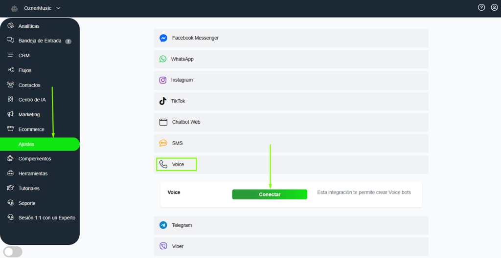 Vaya a Configuración > Canales > Voz y haga clic en el botón de conexión.