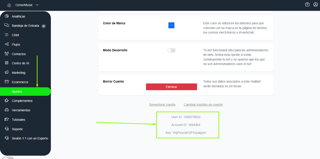Puede obtener el ID de la cuenta y el account_key yendo a Configuración > General. Estos datos se encuentran al final de la página.