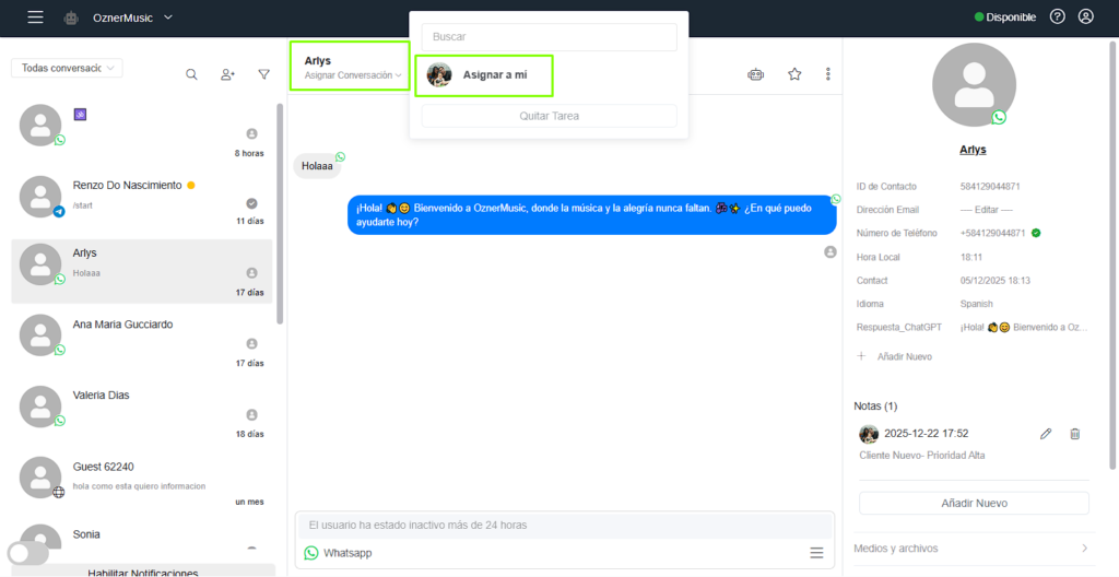 Una vez asignada, podrás ver claramente a quién pertenece la conversación.