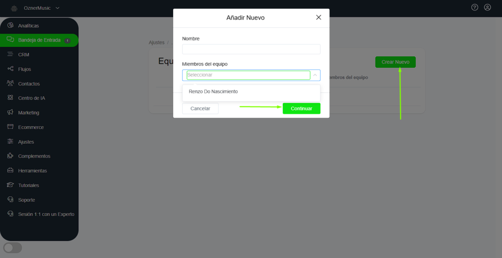 Haz clic en Gestionar, asigna un nombre a tu equipo y selecciona los miembros que formarán parte del mismo.