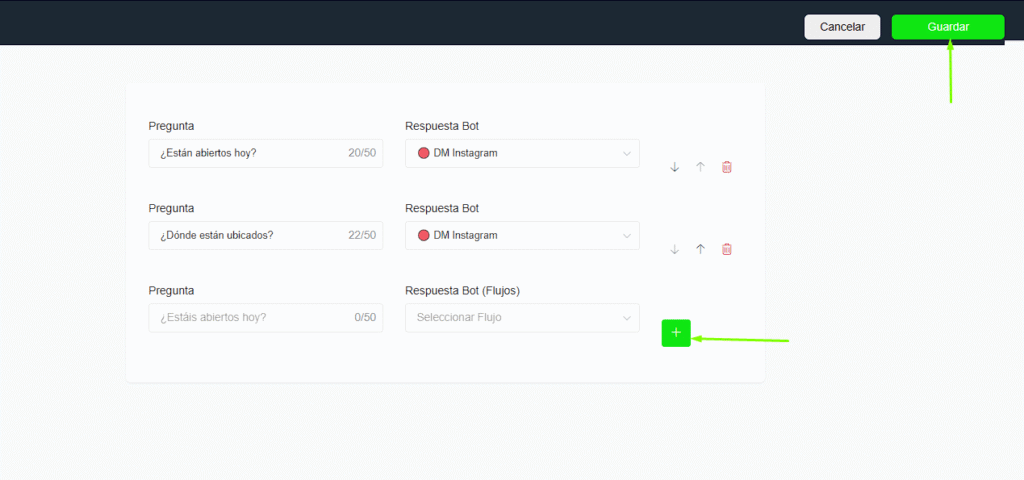 Ingresa las preguntas frecuentes de tu empresa y asigna el flujo de respuesta correspondiente a cada pregunta.