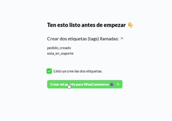 4️⃣ Haz clic en el botón «Crear mi agente para WooCommerce» para iniciar el proceso guiado.
