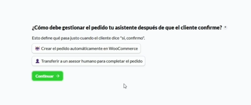 7️⃣ El sistema te preguntará: ¿Qué debe hacer el asistente después de que el cliente confirme la compra? Tienes dos opciones: