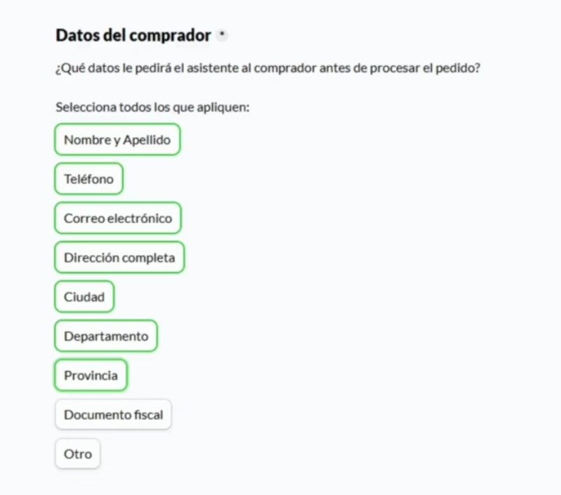 - Datos del Comprador: Selecciona la información que el agente debe pedir (Nombre, Teléfono, Dirección, etc.) para poder procesar la compra.