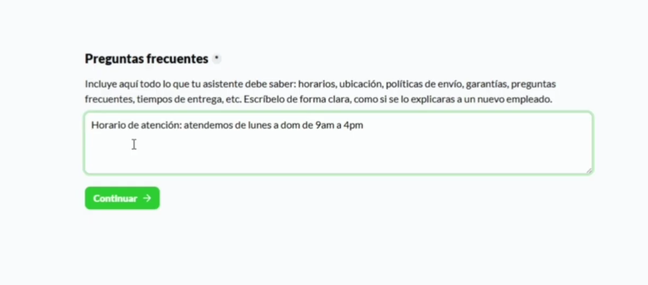 6️⃣ Escribe tus Preguntas Frecuentes. Simplemente coloca el par de «Pregunta – Respuesta» (ej. ¿Cuál es el horario? – Atendemos de 9 a 4 pm). ¡No te preocupes por la lógica! El prompt se encargará de enseñarle esto a la IA.