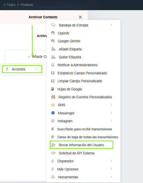 También puedes eliminar contactos automáticamente dentro de un flujo utilizando una acción: