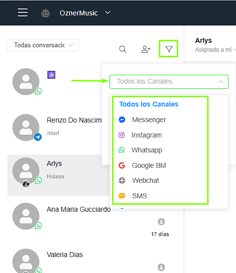 Haz clic en el ícono de Filtro y selecciona el canal que deseas visualizar.