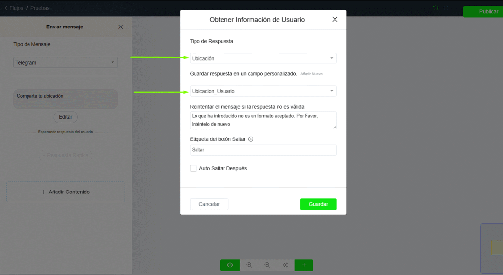 WHAPIFY ofrece una herramienta poderosa para solicitar y obtener la ubicación de tus clientes a través de los canales WhatsApp, Viber y Telegram.Esta funcionalidad es clave para conocer la ubicación del usuario en diferentes momentos del recorrido del cliente y permite trabajar con datos geográficos dentro de tus flujos automatizados.La plataforma proporciona dos campos del sistema que puedes utilizar para ejecutar acciones basadas en la ubicación 📍🌎⚙️ Pasos para solicitar la ubicación del usuario