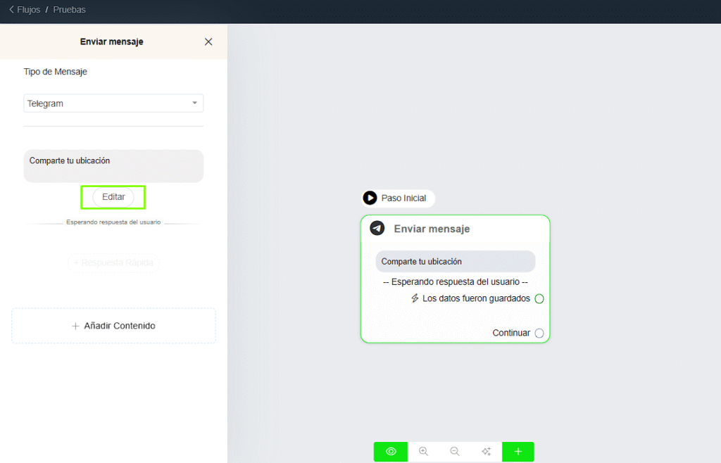 En el generador de flujos, agrega el bloque “Obtener información del usuario”. Este bloque permite que el usuario comparta su ubicación directamente desde su aplicación de mensajería.