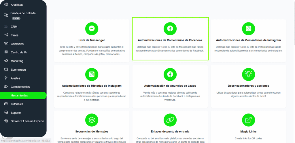 Dirígete a Herramientas → Comentarios de Facebook dentro de Whapify.
