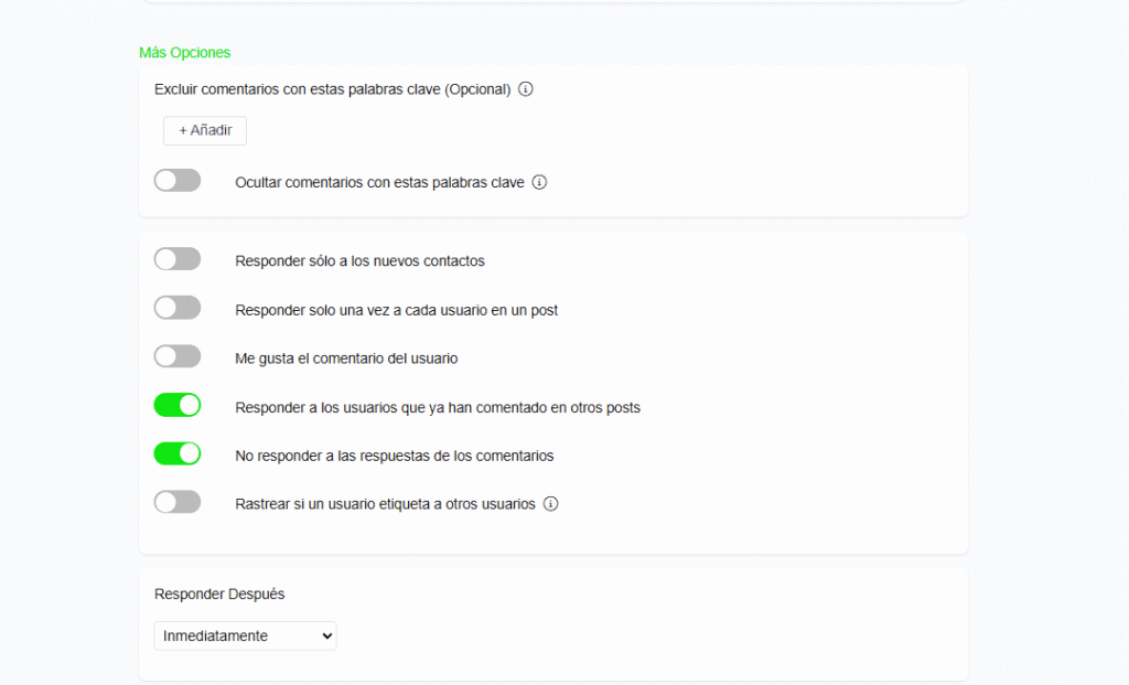 - Comentarios que contienen: responde si el comentario incluye determinadas palabras clave.