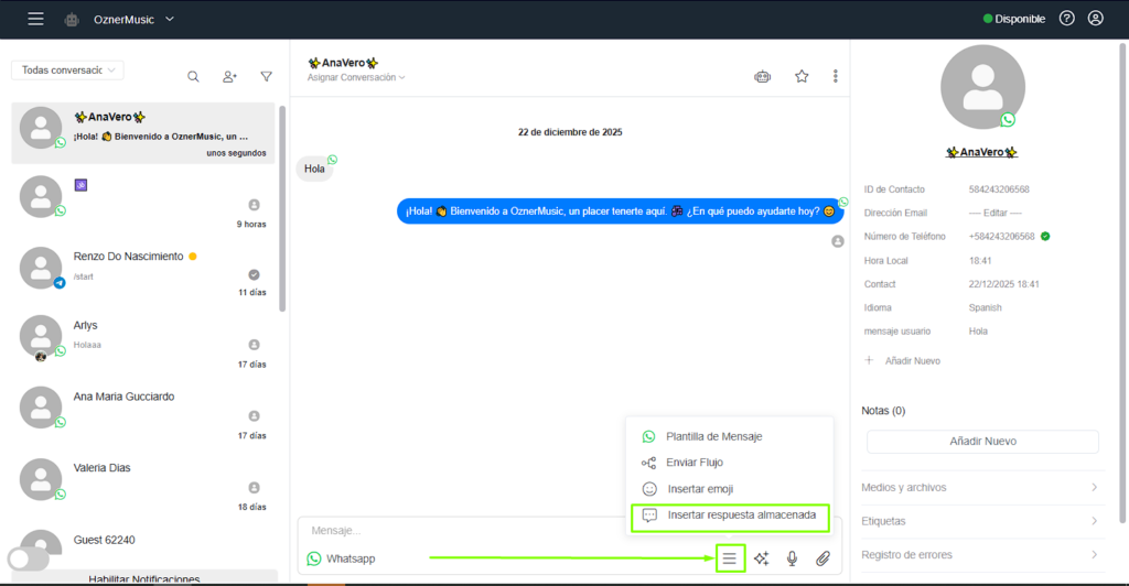 Para ver y utilizar las respuestas guardadas directamente desde la conversación: