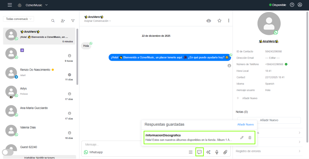 Las respuestas guardadas te permiten crear y almacenar mensajes reutilizables como respuestas a preguntas frecuentes, saludos o mensajes estándar, ayudándote a responder a tus clientes de forma mucho más rápida y consistente.