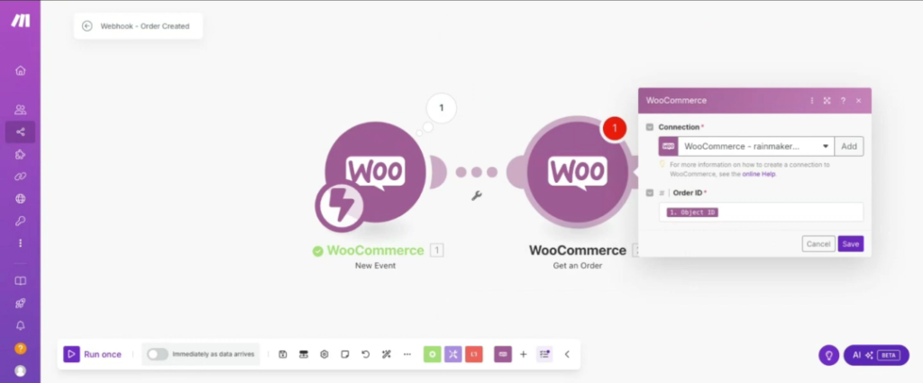 1️⃣4️⃣ Añade otro módulo de WooCommerce llamado Get an Order y mapea el Object ID que te dio el webhook anterior.