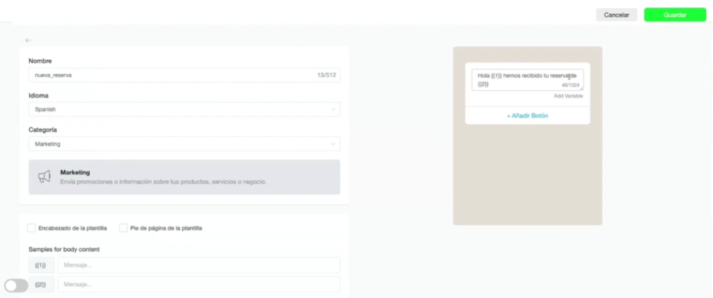3️⃣ Configura tu plantilla (Categoría: Marketing, Idioma: Spanish) y redacta tu mensaje usando variables, por ejemplo: