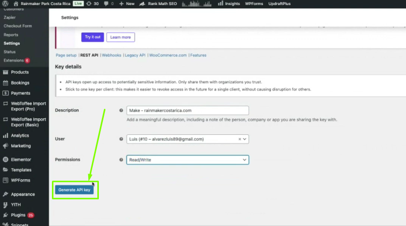 1️⃣1️⃣ Para obtener la API Key, ve a tu panel de WordPress: WooCommerce → Ajustes → Avanzado → API REST → Añadir clave.