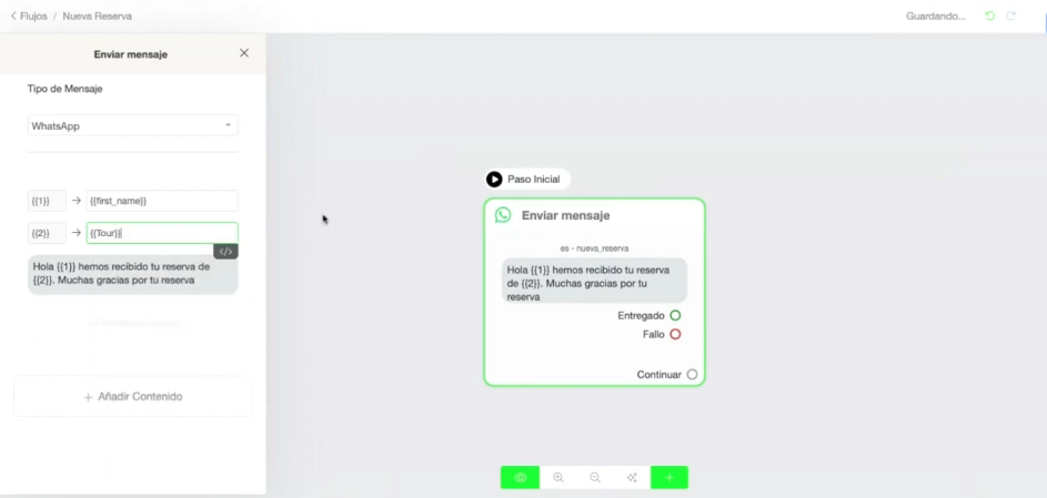 • Para {{2}} selecciona o crea un campo personalizado llamado Tour (o «Pedido»).