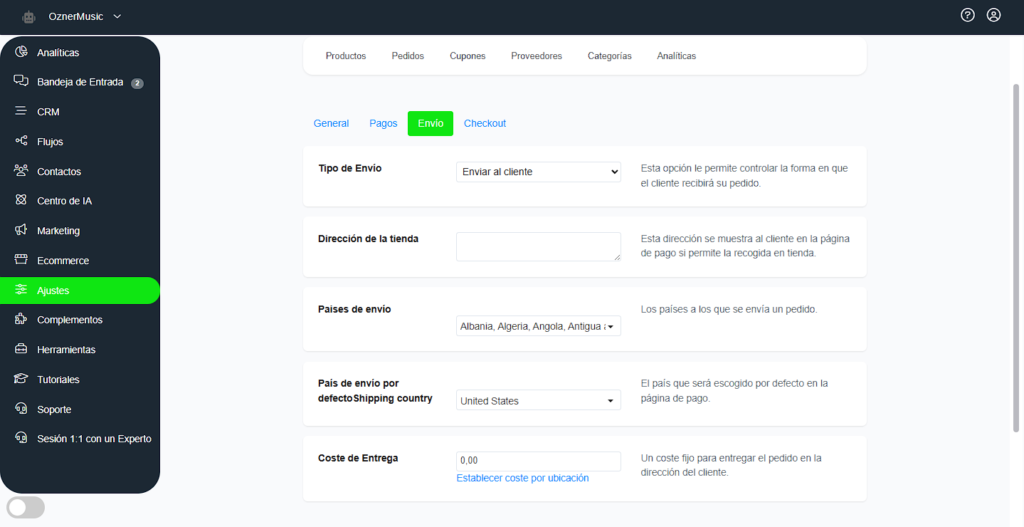 En la pestaña de configuración de envío podrás seleccionar el tipo de envío que deseas ofrecer a tus clientes: