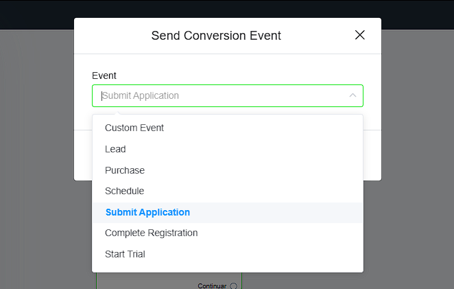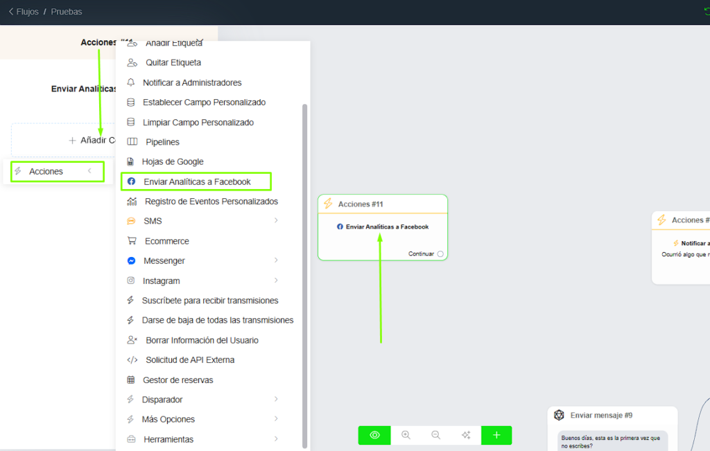 Para enviar eventos de conversión a Facebook, debe utilizar la opción:Acciones > Enviar evento de conversión dentro del flujo correspondiente.