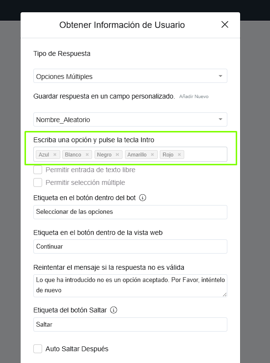 La opción múltiple dinámica permite que tu bot haga preguntas y genere las opciones