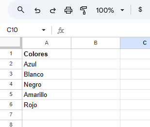 [ «Azul», «Blanco», «Negro», «Amarillo», «Rojo» ]
